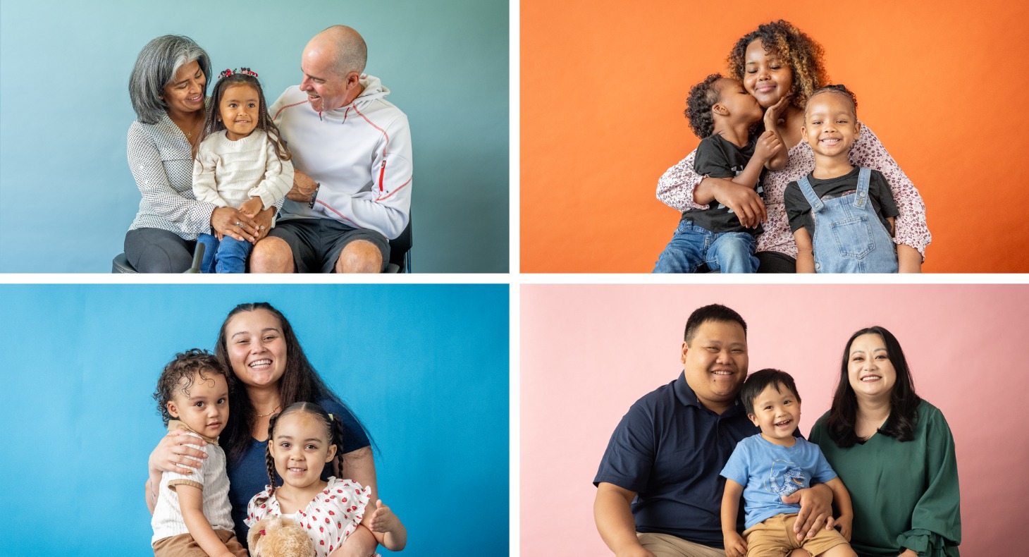 Four different ECFE families: a child with older caregivers, a Black mother with two children, two Hmong parents with one child, and a Latine mother with two children