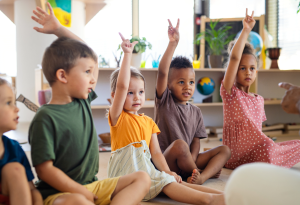 Young children raising their hands in a classroom setting.